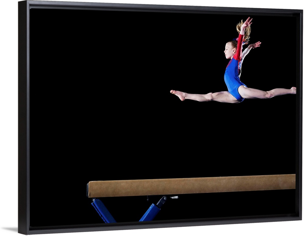 <p>Gymnast (9-10) leaping on balance beam</p>