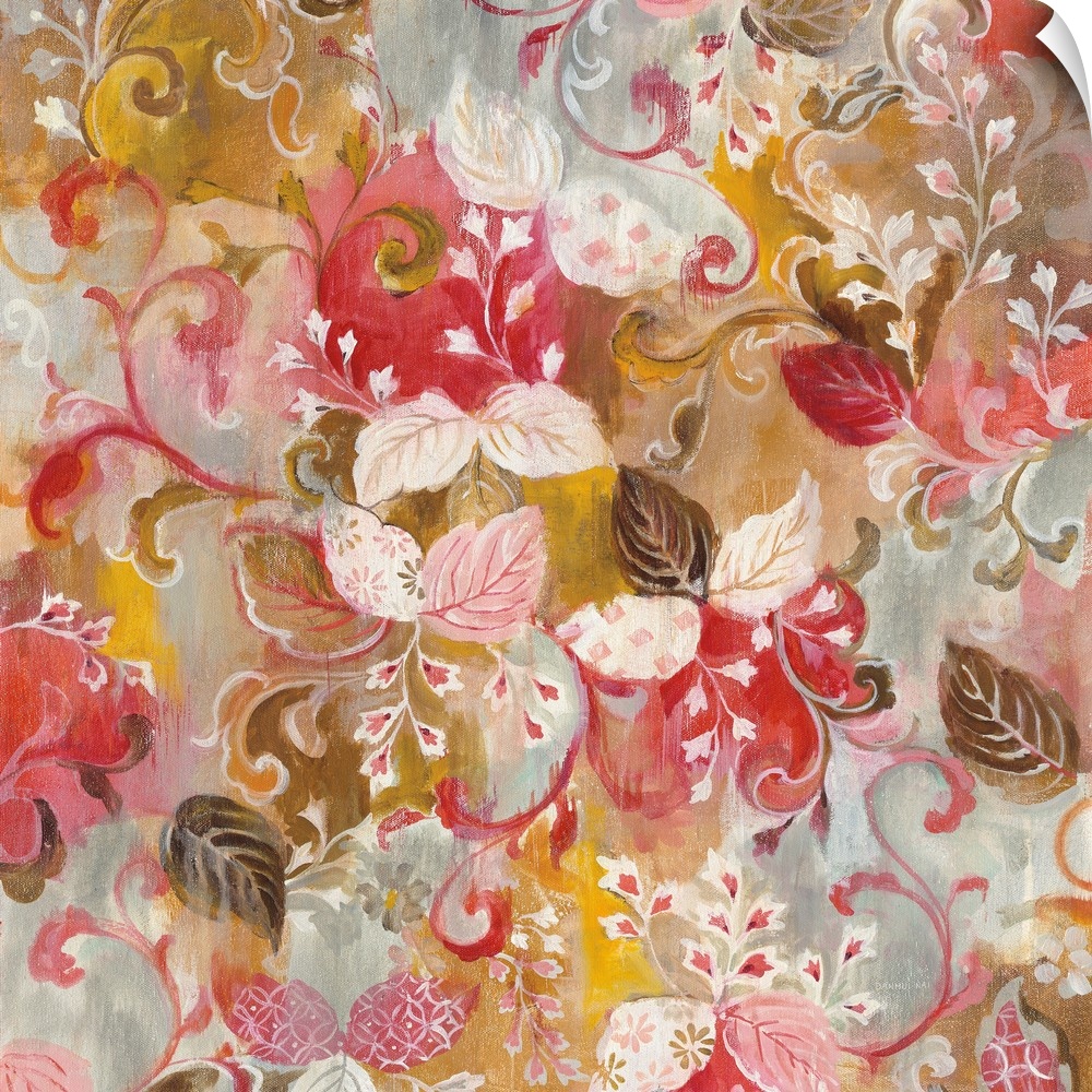<p>Square painting of pink, white, and brown leaves and flowers with a red, gold, and grey background.</p>