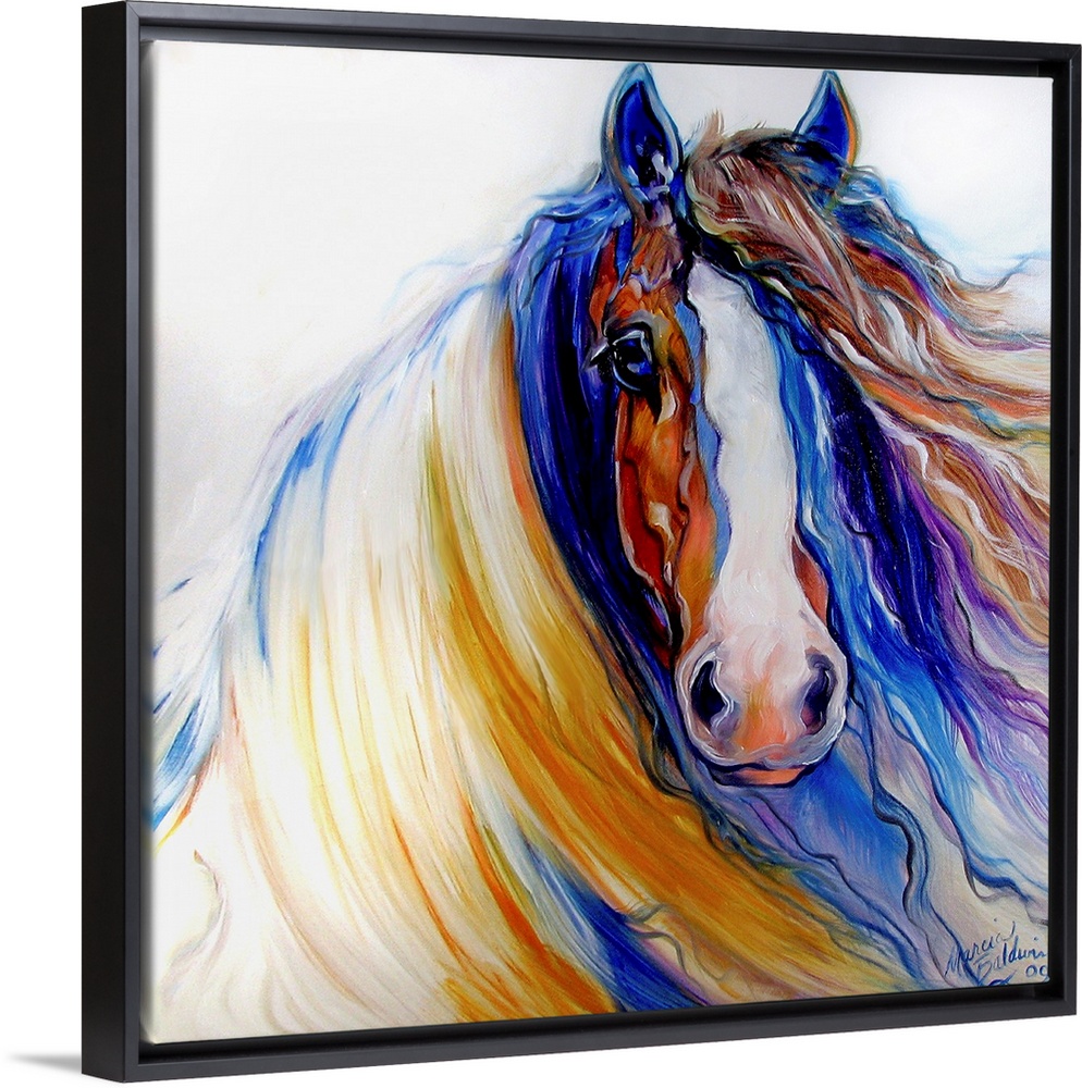 <p>Contemporary square painting of the Gypsy Vanner with a strong and bold face and gorgeous long mane in gold, blue, and purple hues.</p>