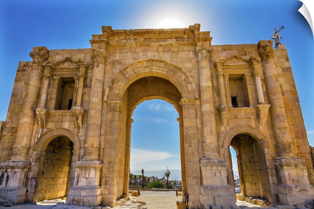 <p>Hadrian's Arch Gate Sun Ancient Roman City Jerash Jordan. Jerash came to power 300 BC to 100 AD and was a city through 600 AD. Not conquered until 1112 AD by Crusaders. Famous Trading Center. Most original Roman City in the Middle East.</p>