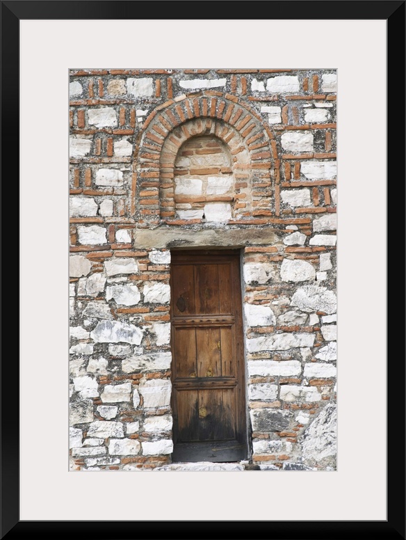 <p>The Hagia Triada Church. Detail of an old wooden door and arched window. Berat upper citadel old walled city. Albania, Balkan, Europe.</p>