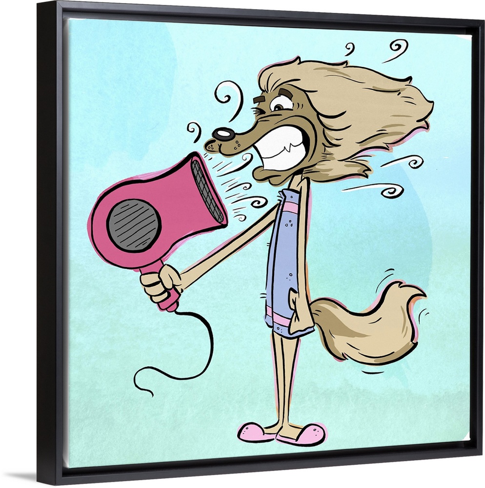 <p>Cute cartoon artwork of an Afghan dog blow-drying her hair.</p>