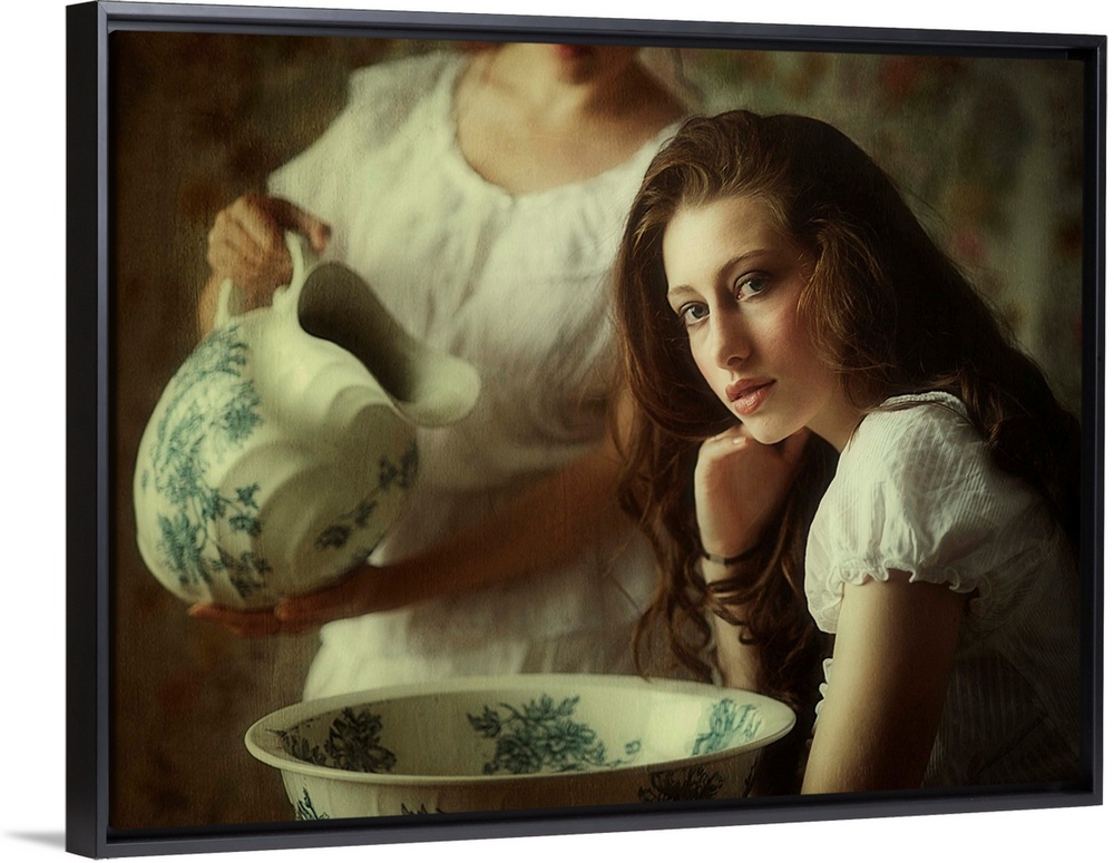 <p>A woman with beautiful flowing hair with a wash basin, getting ready to bathe.</p>