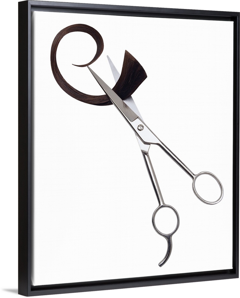 <p>Portrait photograph on a big canvas of a pair of hairdressing scissors, slightly open as they clench a curled chunk of hair in the blades, on a solid white background.</p>