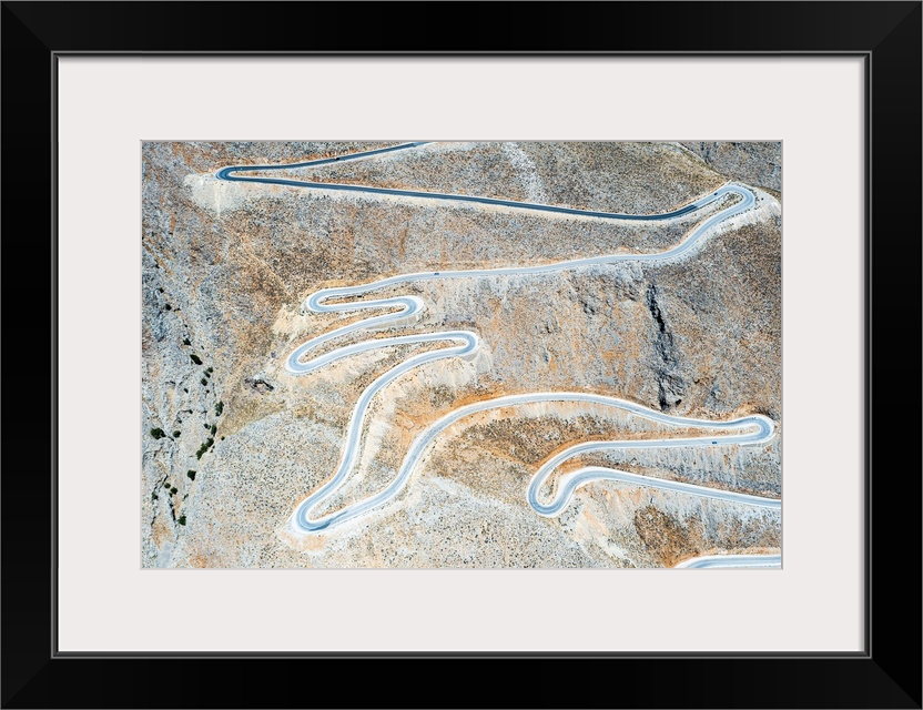 <p>Hairpin bends of mountain road from above, aerial view, Crete island, Greek Islands, Greece, Europe</p>