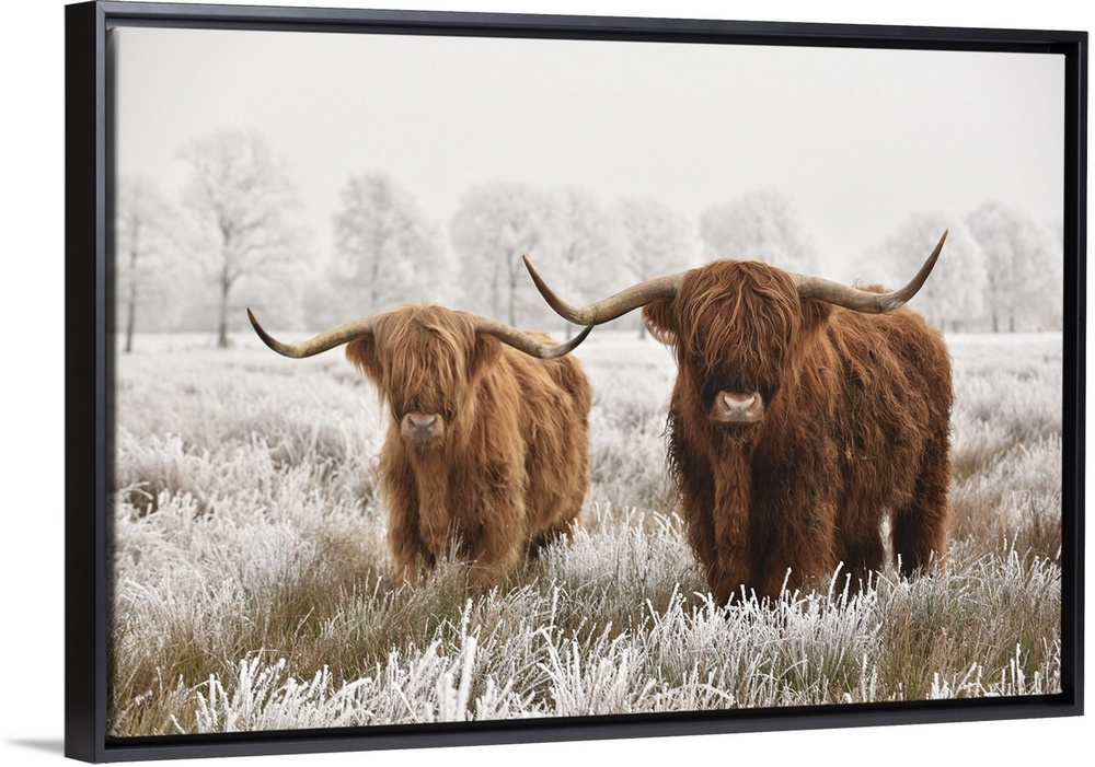 <p>Hairy Scottish highlanders in a natural winter landscape of a national park in the Drenthe region of The Netherlands.</p>