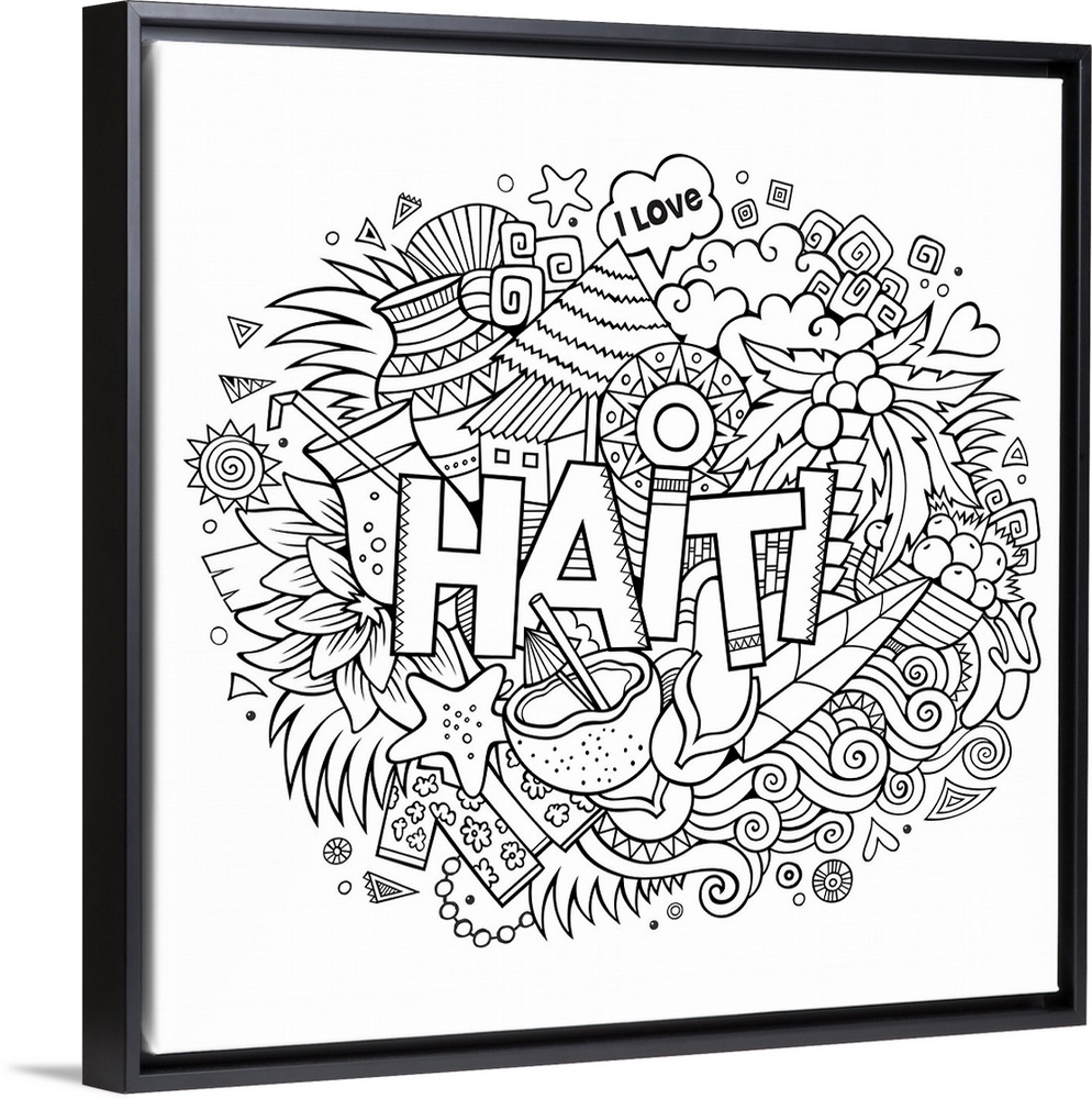 <p>As assortment of tropical and Haitian-themed objects surrounding the word "Haiti."</p>
