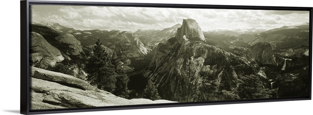 <p>Panoramic photograph of mountain range under a cloudy sky with cliff's edge in foreground.</p>