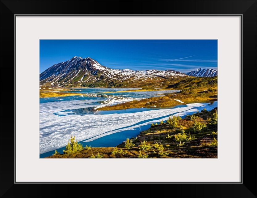 <p>Half frozen Lost Lake in the morning, Chugach Mountains in the background. Chugach National Forest, Kenai Peninsula, South-central Alaska in springtime; Seward, Alaska, United States of America.</p>