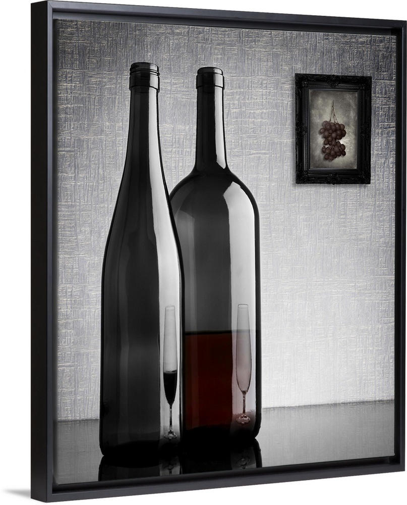 <p>Two glass wine bottles with reflections of glasses on them, and a framed image of grapes on the wall.</p>