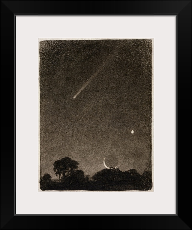 <p>Halley's Comet. Historical photomechanical print depicting the 1910 appearance of Halley's Comet with Venus (lower right) and The Moon (bottom centre). Halley's Comet is the only naked-eye comet certain to return within a human lifetime (every 75 years or so). It derives its name from the English astronomer Edmond Halley (1656-1742) who computed its orbit. In 1910 the comet's approach was relatively close, and on 18 May the Earth passed through the comet's tail. Created in 1910.</p>