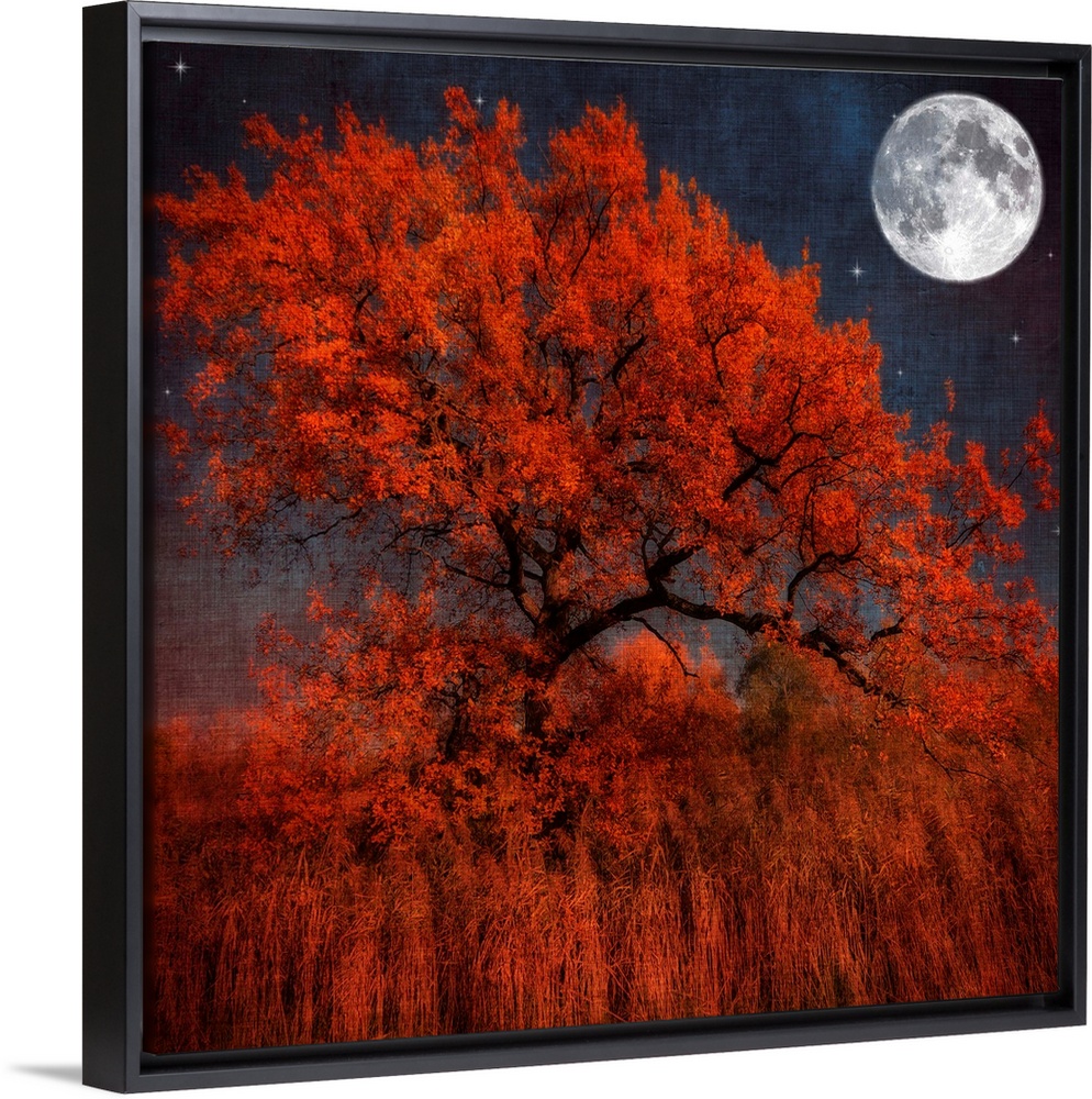 <p>A large tree with autumn leaves sits in a field of tall orange grass. A full moon and several stars shine brightly in the sky.</p>