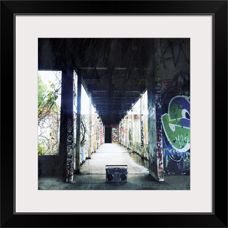 <p>A classic boom box stereo sitting in an abandoned building with walls covered in graffiti.</p>