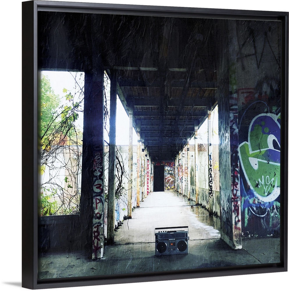 <p>A classic boom box stereo sitting in an abandoned building with walls covered in graffiti.</p>