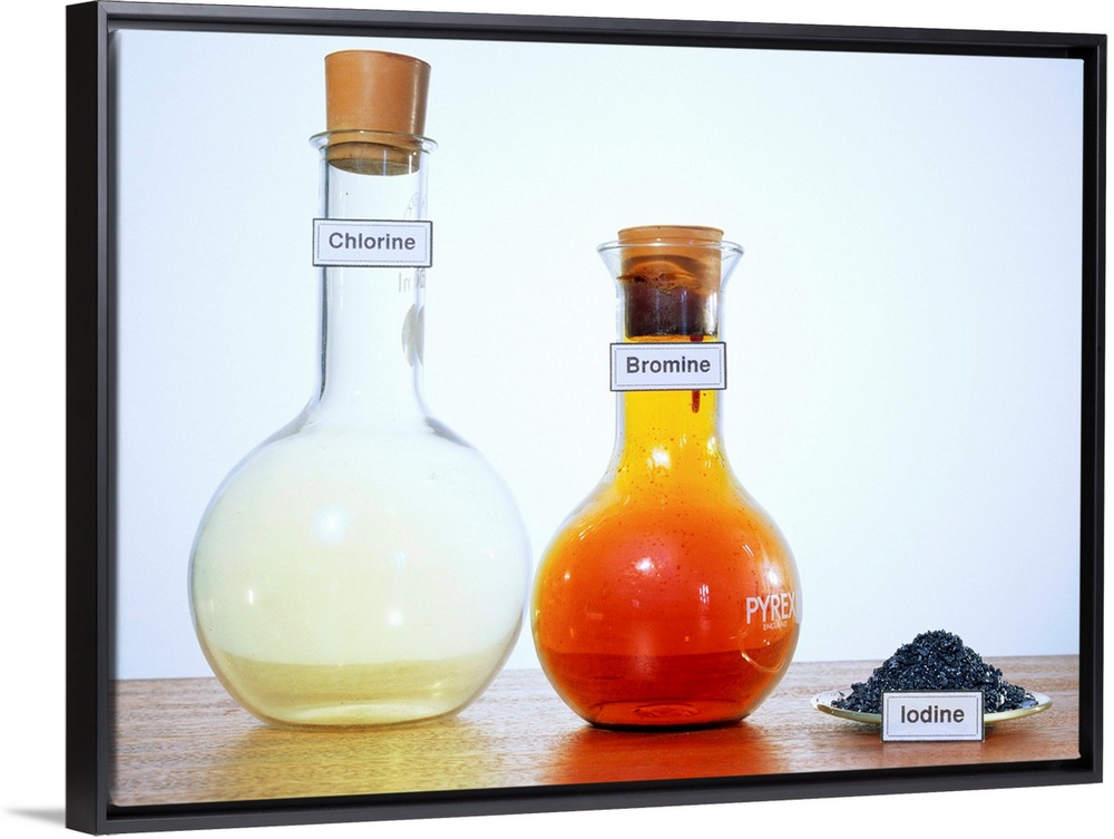 <p>Halogens. Three halogen elements, from left to right: chlorine (Cl2), bromine (Br2) and iodine (I2). These are toxic and reactive non-metals. Chlorine is a gas at room temperature. It was used as a chemical weapon during World War One. Bromine is a dark liquid at room temperature, although it readily produces a brown vapour. Iodine is a crystalline solid.</p>