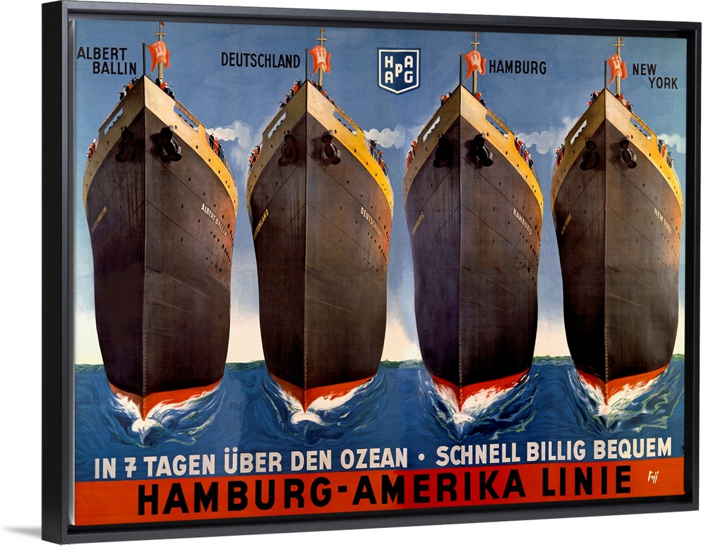 <p>Vintage poster advertising ships. There are four images of ships with the text "Alber Ballin, Deutschland, Hamburg, and New York."</p>