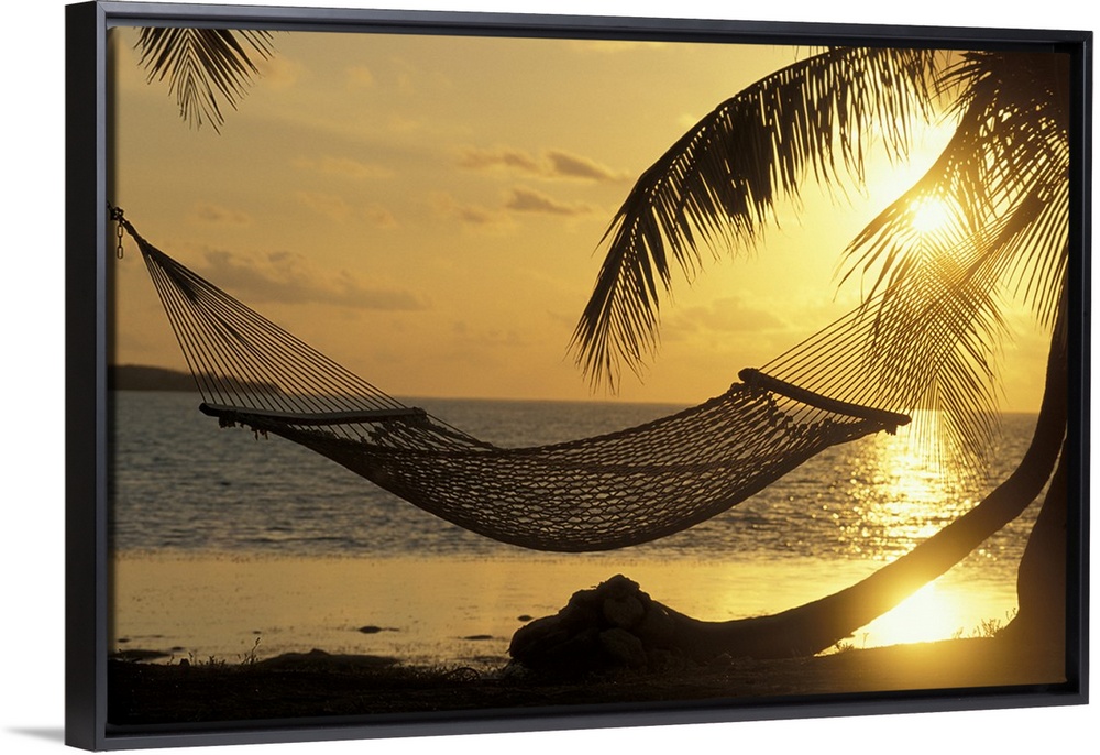 <p>Huge photograph shows a bed of heavy netting as it sits suspended between two palm trees on a sandy beach. In the distance the sun begins to set and sparkle over the ocean in the background.</p>