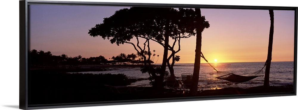 <p>Panoramic photo on canvas of the silhouette of trees and a hammock with the sun setting into the ocean in the distance.</p>