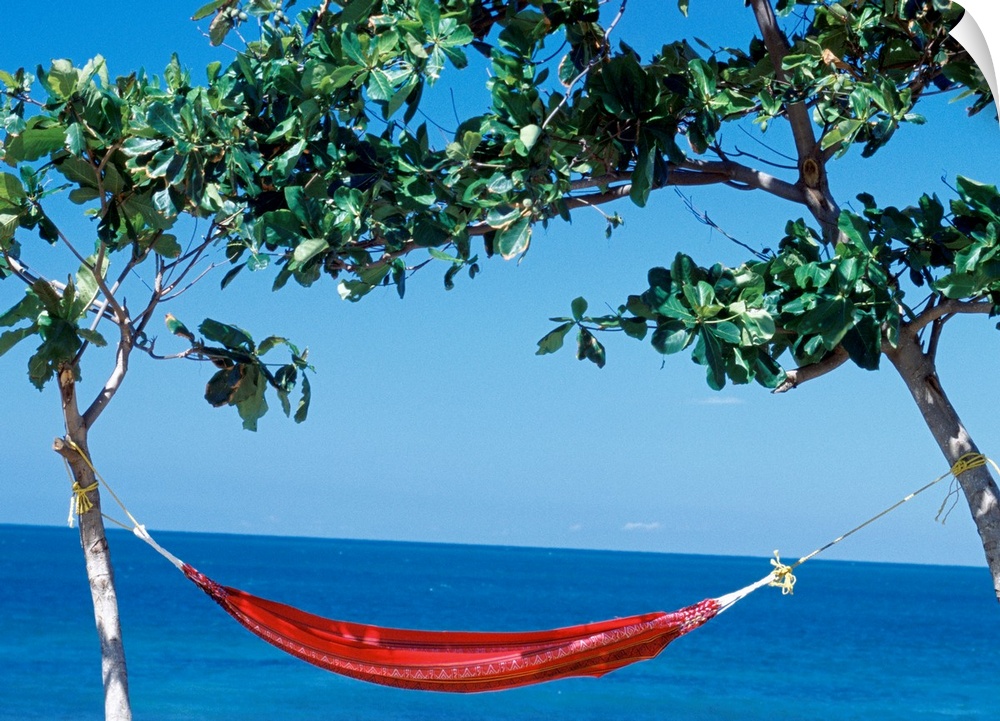 <p>A hammock is tied up between two small trees with a beautiful ocean view behind it.</p>