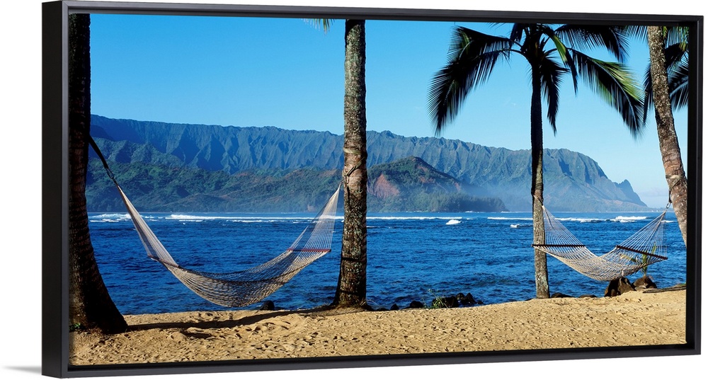 <p>Panoramic photograph showcases a couple hammocks between palm trees on a beach within Hanalei Bay in Kauai, Hawaii. In the background, you can see the waves of the ocean crashing into the rocky mountains.</p>