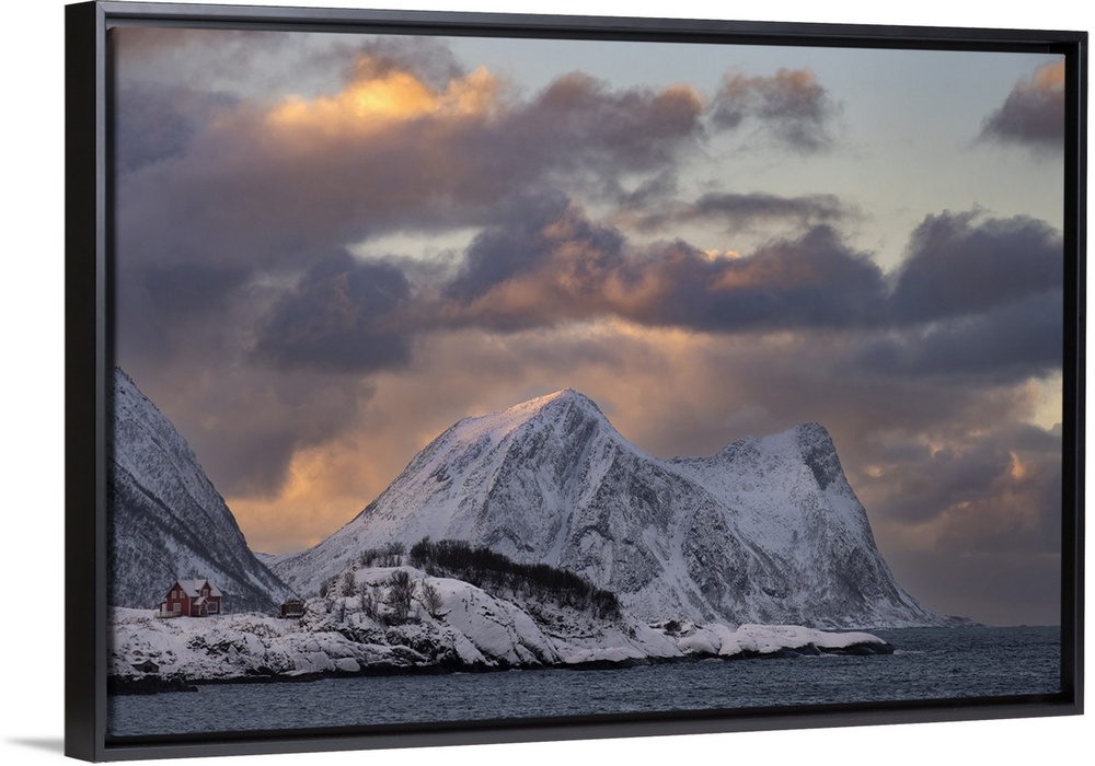 <p>View of Hamn and Teistevika at sunset backed by Indre Teisten mountain, Hamn, Senja, Troms og Finnmark County, Norway, Scandinavia, Europe</p>