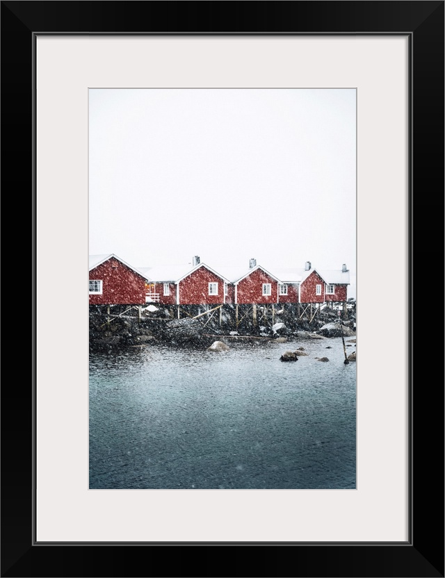 <p>Hamnoy village with snowflakes, Reine Bay, Lofoten Islands, Nordland, Norway.</p>