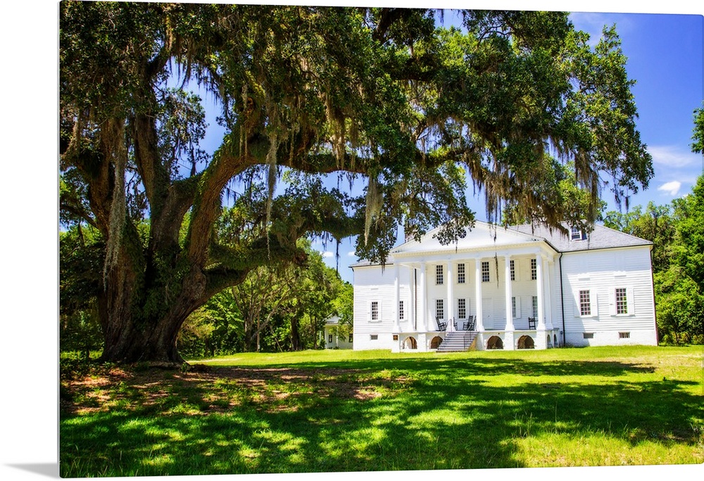 <p>Photograph of the Historic Hampton Plantation with a large Oak tree in the front.</p>