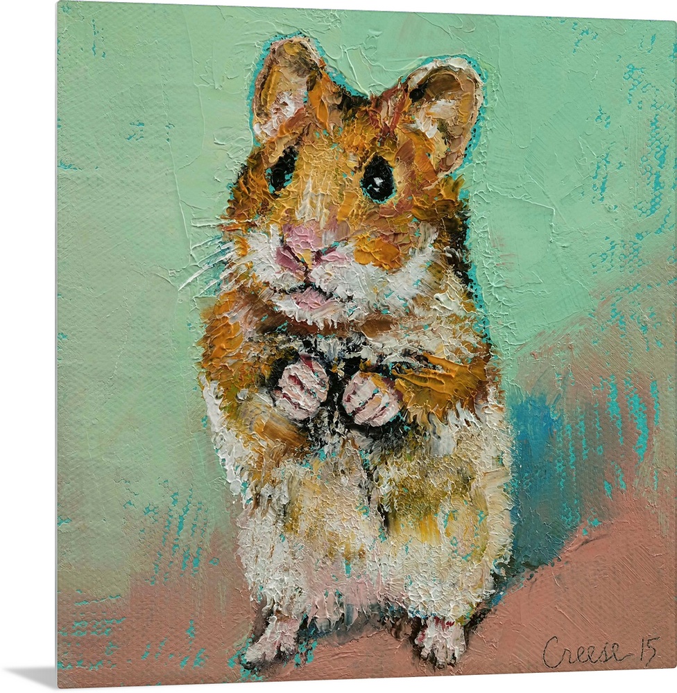 <p>A contemporary painting of a little brown and white hamster against a green and brown background.</p>