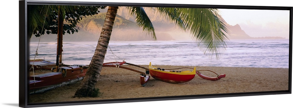 <p>Panoramic photograph shows a boat sitting beneath a palm tree on the sandy shores of a beach in the Pacific Ocean. The water in the background can be seen making its way towards the mountains in the distance.</p>