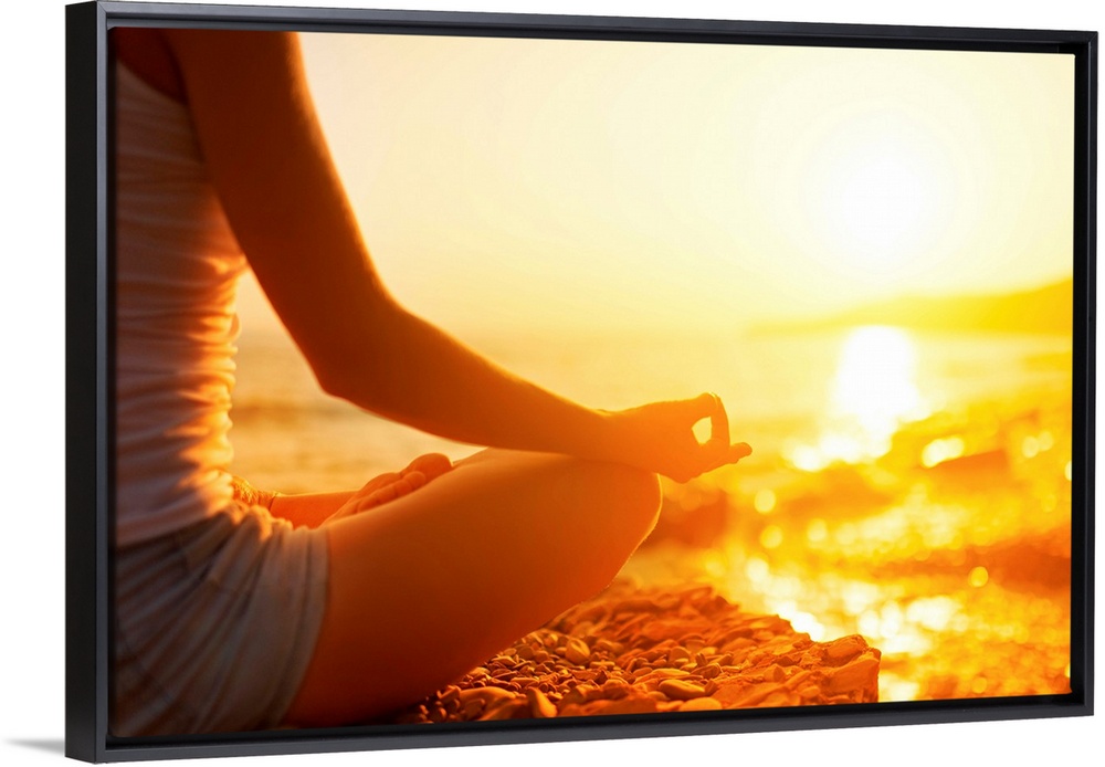 <p>Hand of a woman meditating in a yoga pose on the beach.</p>