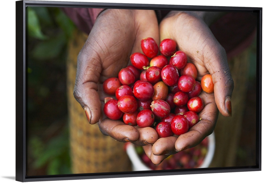 <p>Woman's hands holding ripe Arabica coffee beans picked at Socfinaf's Oakland Estates coffee plantation.</p>