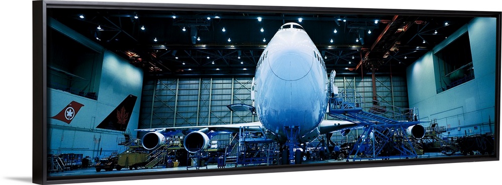 <p>Wide angle picture looking up at the nose of a large airplane in a hanger.</p>