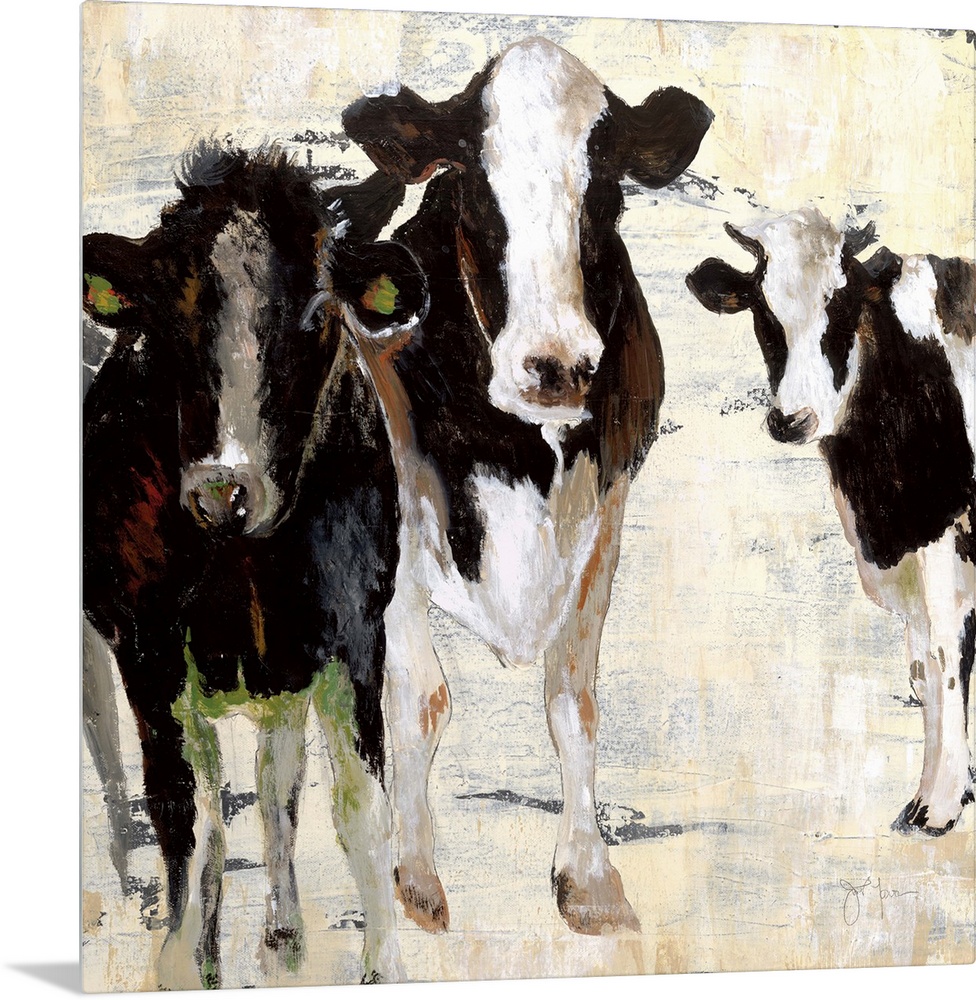 <p>A contemporary painting of three cows standing together using all natural colors with hints of green and red.</p>