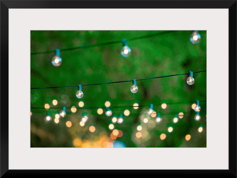 <p>Hanging decorative christmas lights for a back yard party</p>