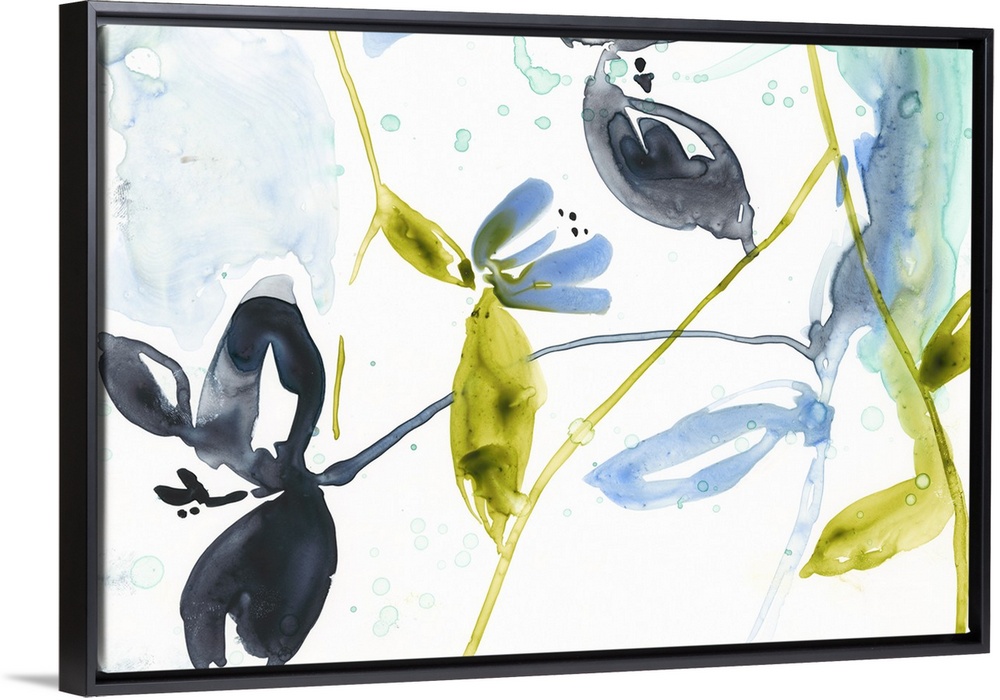 <p>Watercolor painting of flowers and leaves in yellow, black, and blue, on white.</p>