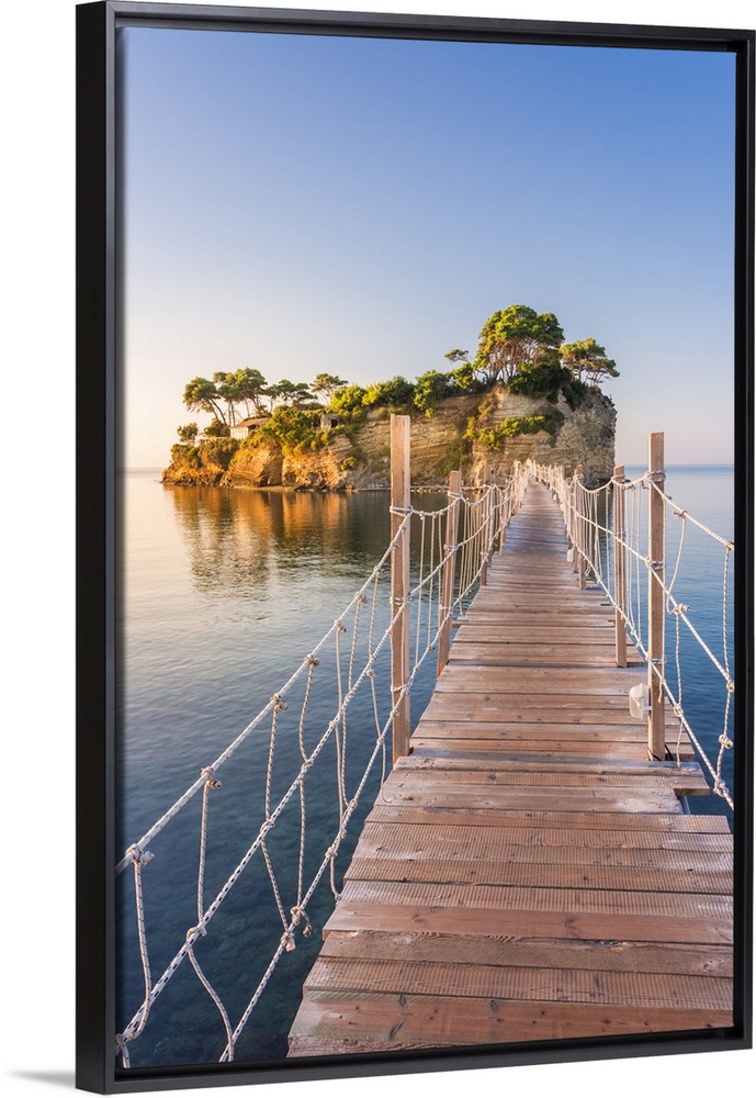 <p>Hanging wooden bridge over the sea leading to Cameo Island, Agios Sostis, Zakynthos, Ionian Islands, Greece.</p>