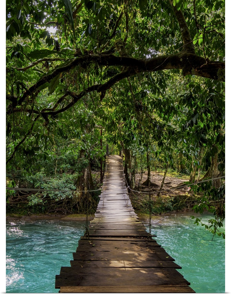<p>Hanging wooden bridge over Xanil River, Arroyo Agua Azul, Chiapas State, Mexico.</p>