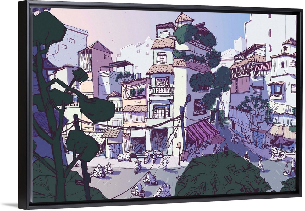 <p>Ink drawing of a typical street in the northern Vietnamese city of Hanoi. I drew it from life from a 3rd floor cafe and colored it digitally after my trip around this amazing country. I enjoyed capturing the details of the street level buildings as well as the pedestrians walking to work between the scooter traffic.</p>