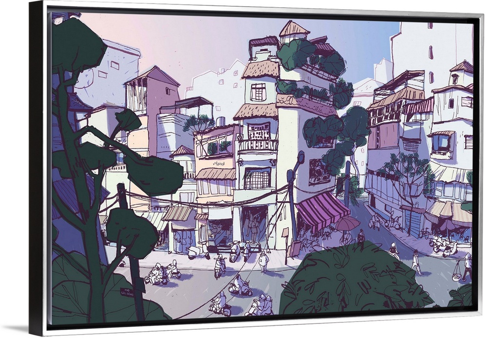 <p>Ink drawing of a typical street in the northern Vietnamese city of Hanoi. I drew it from life from a 3rd floor cafe and colored it digitally after my trip around this amazing country. I enjoyed capturing the details of the street level buildings as well as the pedestrians walking to work between the scooter traffic.</p>