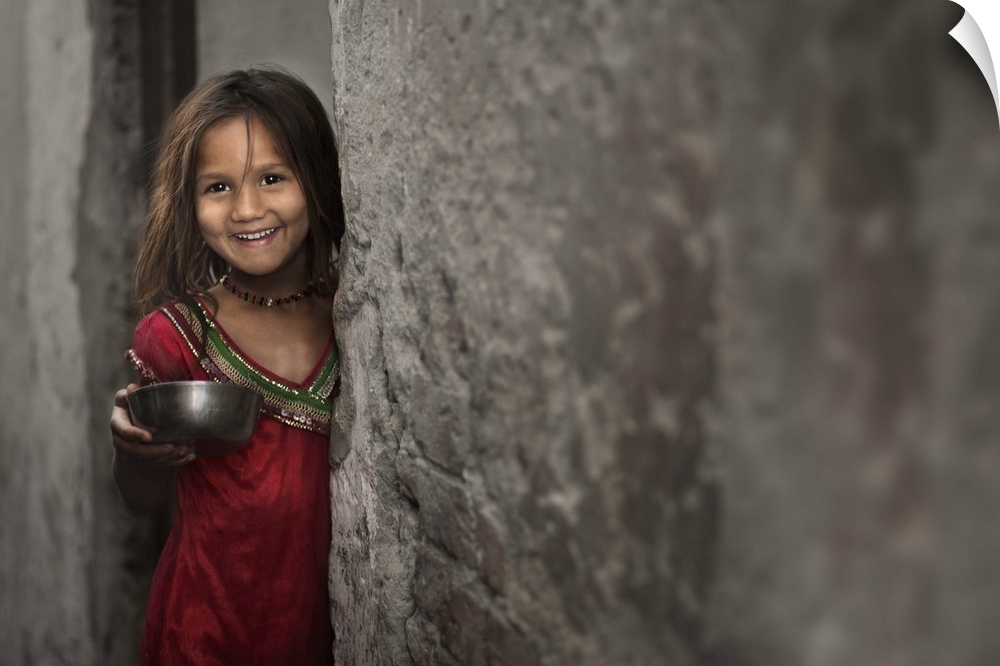<p>A smiling little girl holding a bowl, standing beside a stone wall.</p>