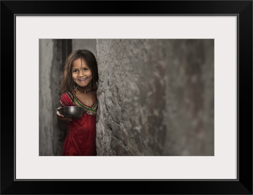 <p>A smiling little girl holding a bowl, standing beside a stone wall.</p>