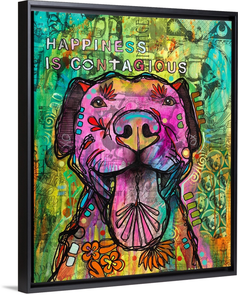 <p>"Happiness is Contagious" stenciled in different colors above an illustration of a pit bull covered in abstract floral markings.</p>