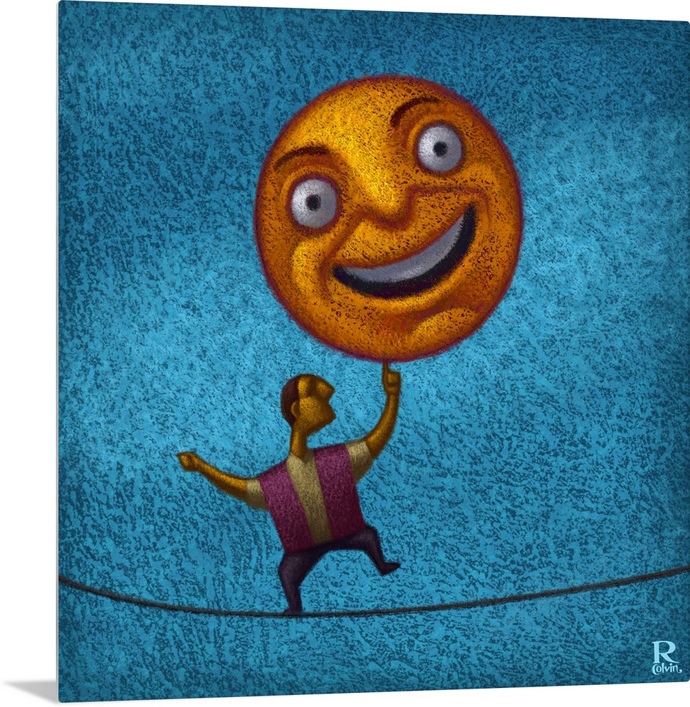 <p>Digital illustration of a man balancing a happy face sun.</p>