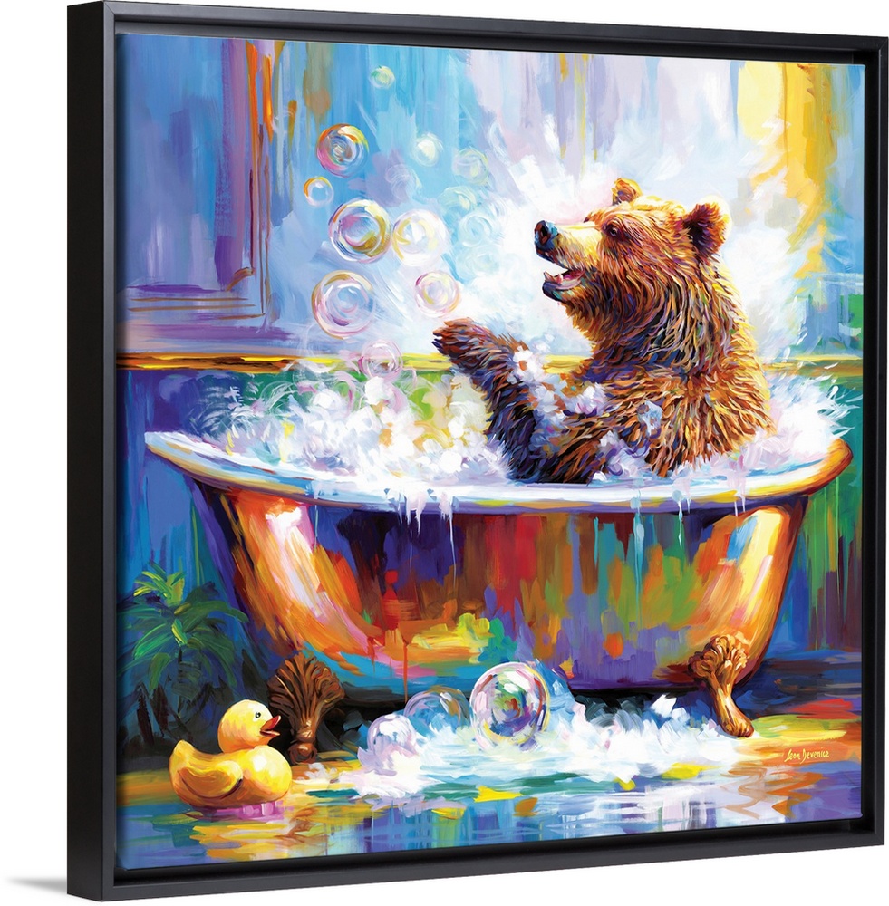 <p>A cheerful artwork of a bear splashing in a bubble-filled bathtub, surrounded by colorful bubbles and a rubber duck.</p>
