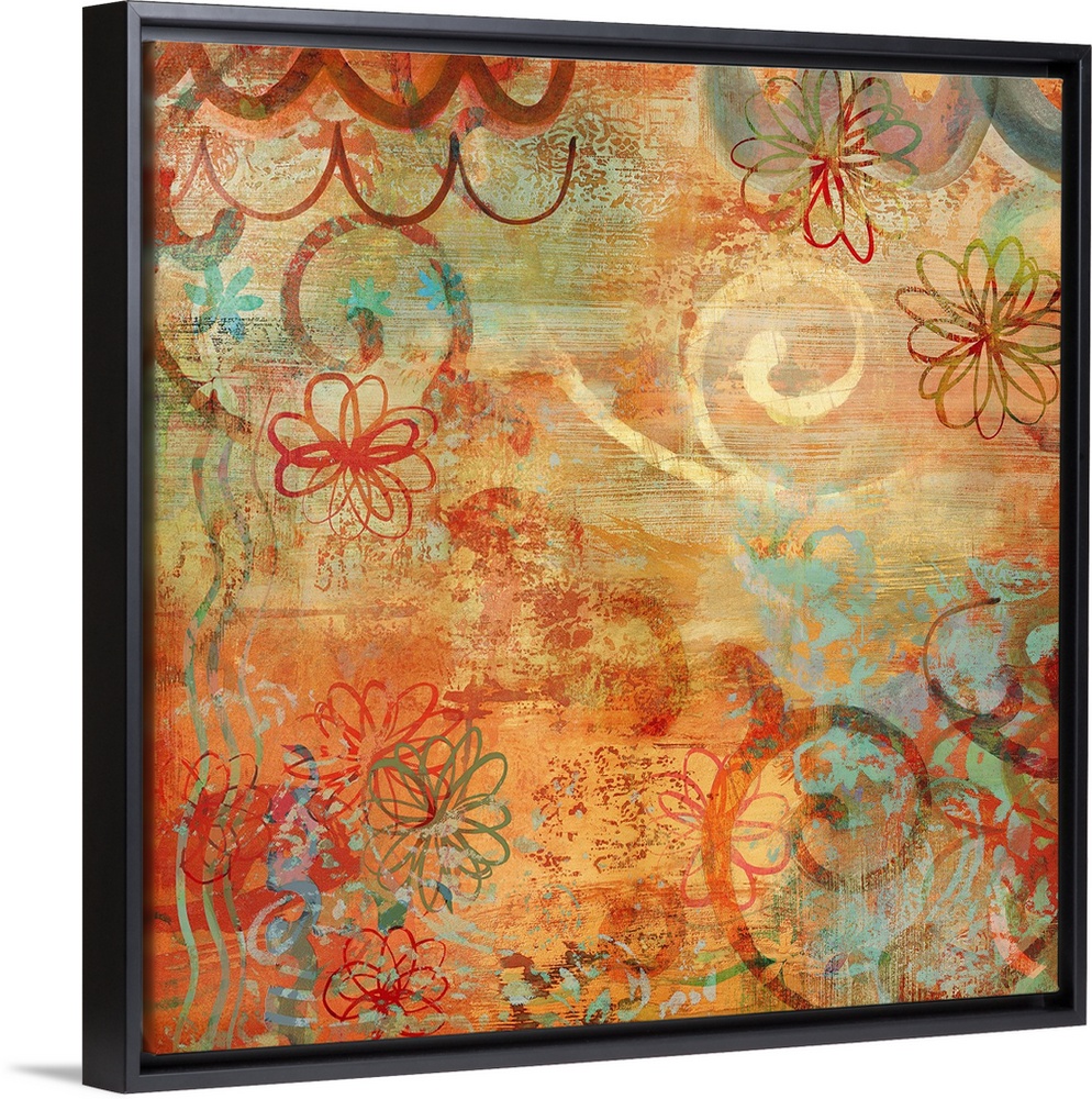 <p>Square abstract art with warm colors, hints of cool blues, and floral illustrations.</p>