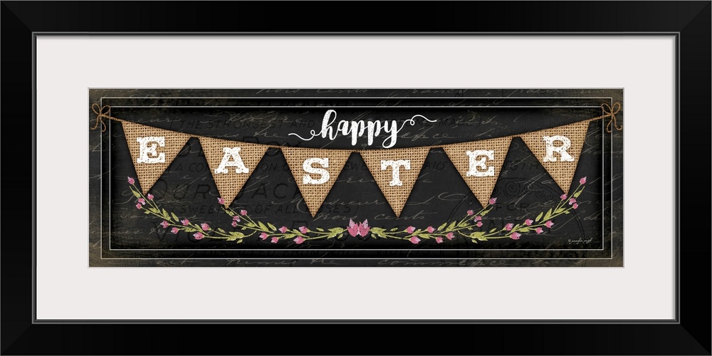 <p>"Happy Easter" on a bunting banner with flowers.</p>