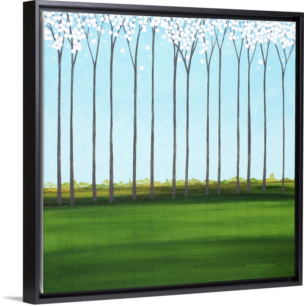 <p>Square minimalist painting of tall, skinny trees with white blossoms.</p>