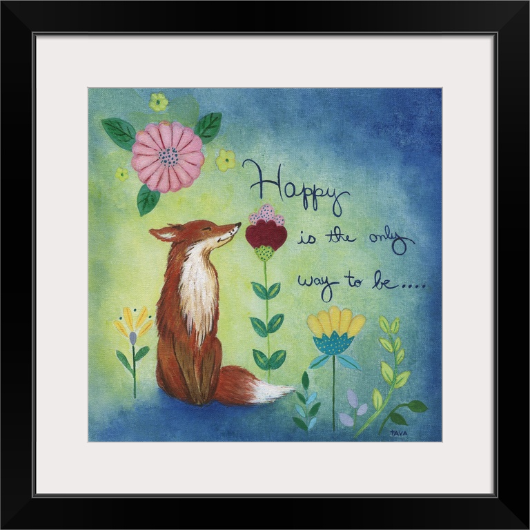 <p>This playful painting consists of a smiling fox and flowers with the words, "Happy is the only way to be" handwritten on a gradated background.</p>