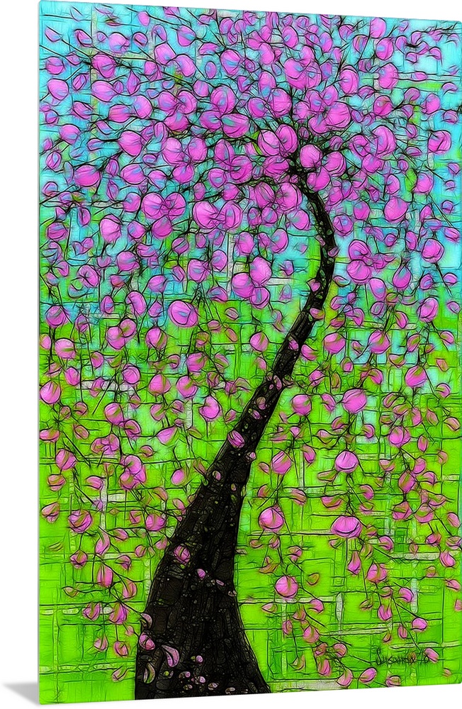 <p>Digital illustration of a large blossoming tree with bright pink flowers on a light blue and green background.</p>