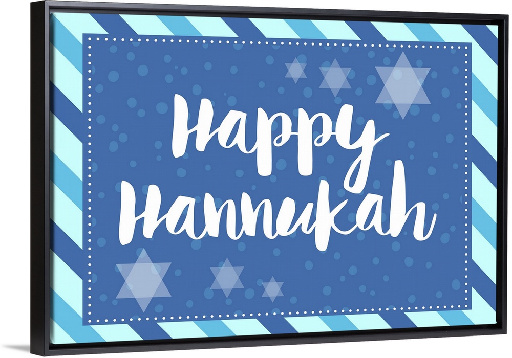 <p>Graphic holiday art in cool tones with large text surrounded by Star of David graphics and a diagonally striped border.</p>